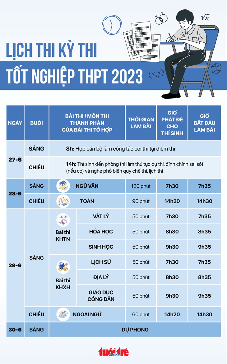 Kỳ thi sẽ diễn ra vào các ngày 28 và 29-6. Trước đó, chiều 27-6 thí sinh sẽ có mặt tại các hội đồng thi để làm thủ tục dự thi.