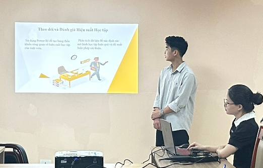 Nhóm sinh viên năm 1 thuyết trình về đề tài “Ứng dụng PowerBI phân tích phổ điểm tại Học viện Phụ nữ Việt Nam”