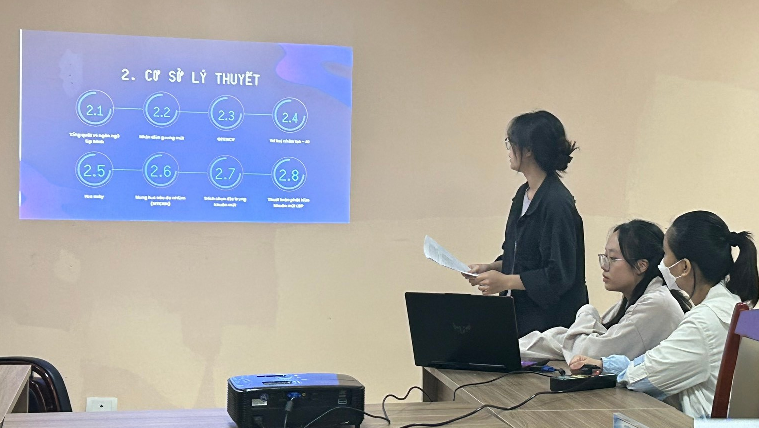 Nhóm sinh viên năm 2 thuyết trình về đề tài “Tìm hiểu về nhận dạng mặt người từ đó xây dựng hệ thống nhận diện khuôn mặt vào ra thư viện – Học viện Phụ nữ Việt Nam”