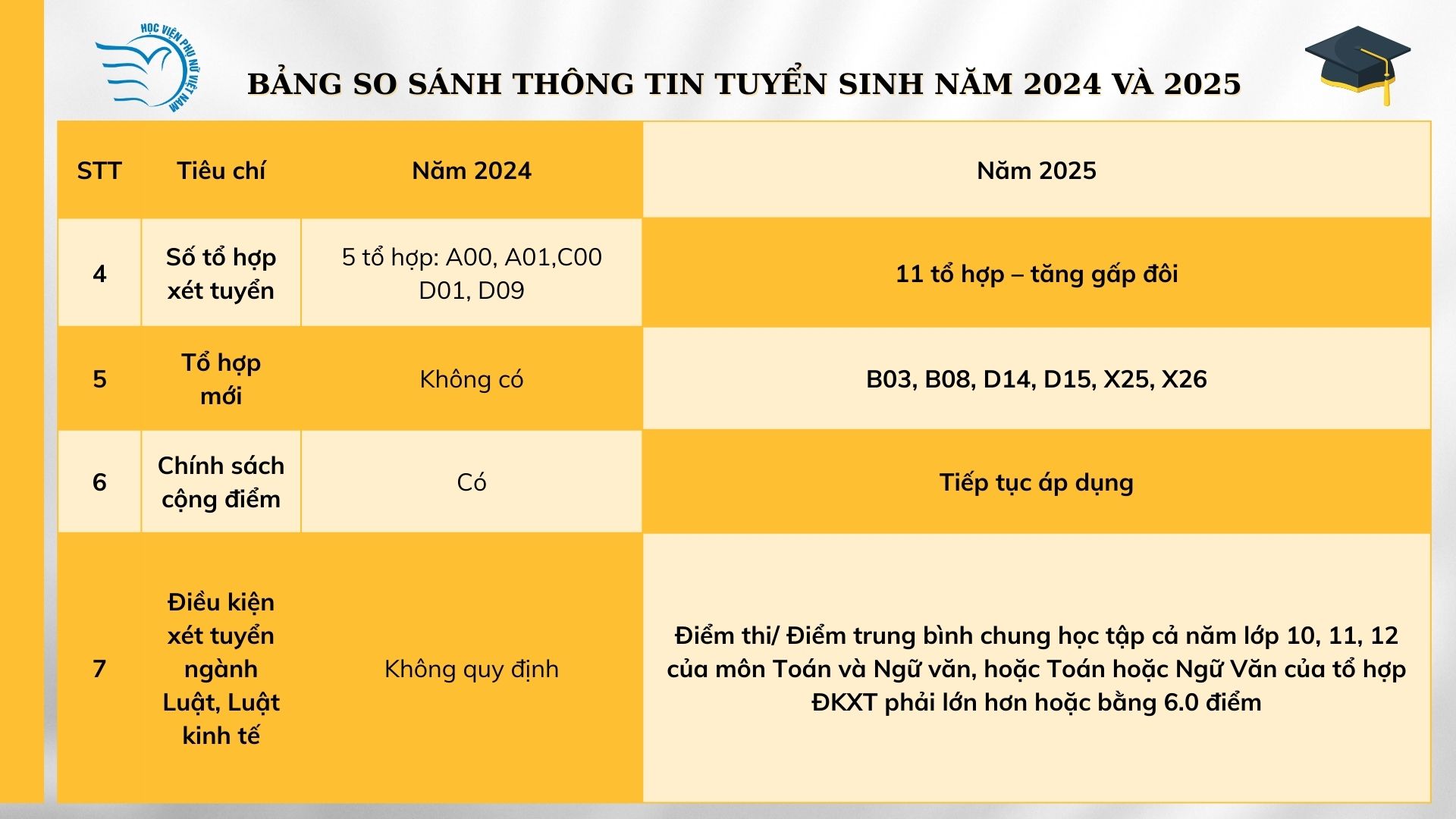 Một điểm nổi bật trong mùa tuyển sinh 2025 là việc Học viện mở rộng từ 5 lên 11 tổ hợp xét tuyển. Nếu như năm 2024, Học viện chỉ sử dụng các tổ hợp như A00, A01, C00, D00, D01, D09, thì năm nay, nhiều tổ hợp mới đã được bổ sung nhằm tạo thuận lợi cho thí sinh ở các tổ hợp có thế mạnh riêng.