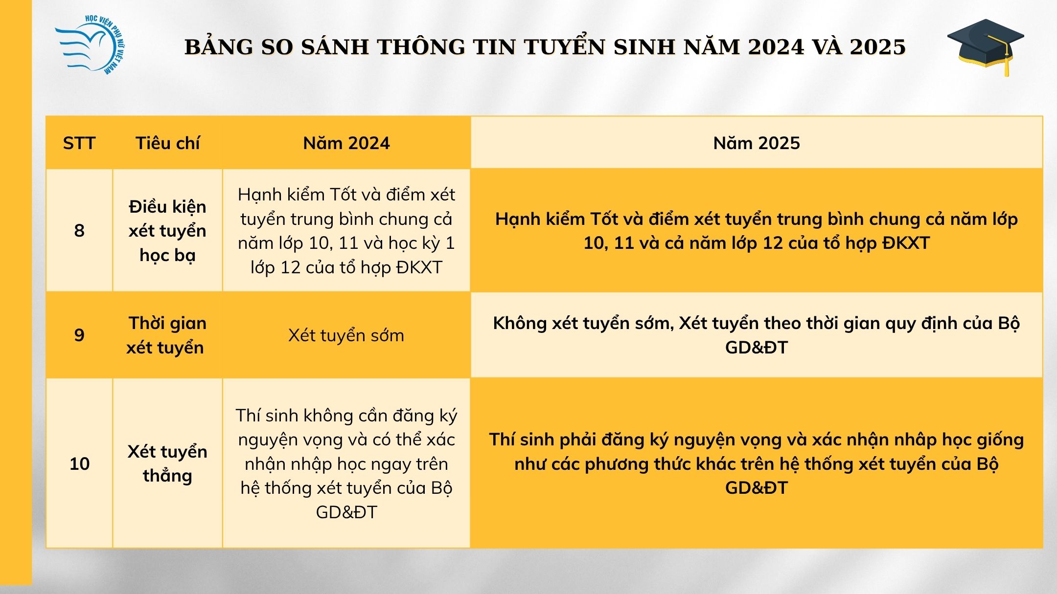 Học viện thêm và thay đổi một số phương thức xét tuyển, giúp thí sinh dễ dàng làm quen và mở rộng cơ hội lựa chọn chiến lược phù hợp với năng lực.