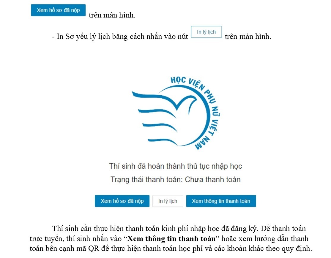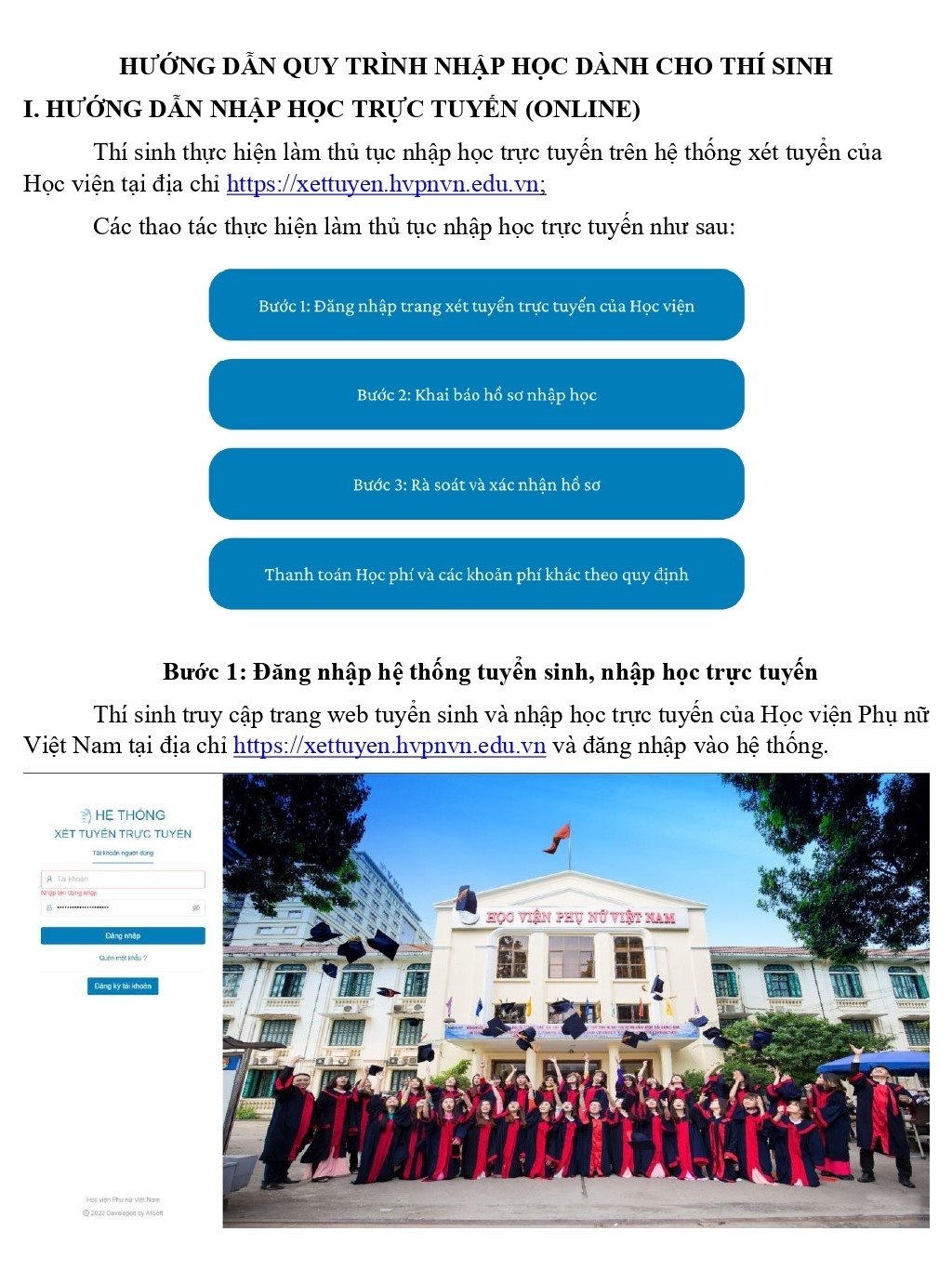 Bước 3: Thí sinh nhập học trực tiếp tại Học viện Phụ nữ Việt Nam. Thời gian nhập học từ ngày 19/8/2024 đến trước 17 giờ 00 ngày 27/8/2024. Hồ sơ nhập học thí sinh cần chuẩn bị xem TẠI ĐÂY