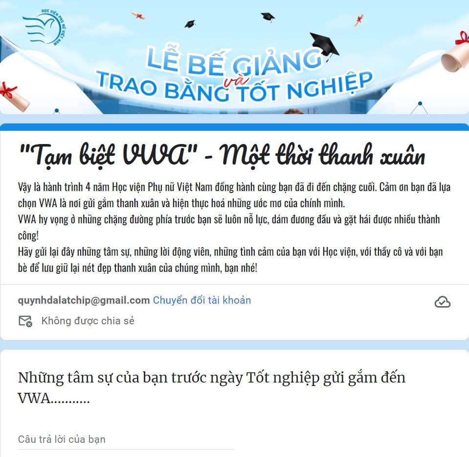 Một thế hệ cựu sinh viên sắp tạm biệt Học viện Phụ nữ Việt Nam, các bạn có thể chia sẻ những dòng cảm xúc của mình TẠI ĐÂY để Học viện lưu lại những cảm xúc đặc biệt hôm nay và những cảm xúc này sẽ trở thành kỉ niệm vô giá của các bạn trong hành trình tương lai sau này.
