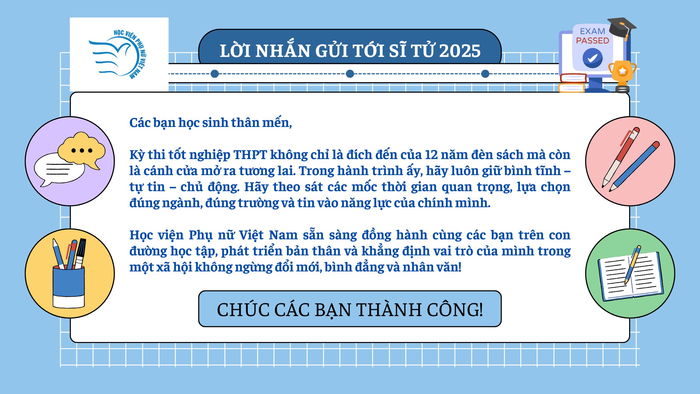 Học viện Phụ nữ Việt Nam tổng hợp và gửi tới các bạn học sinh lớp 12 cùng phụ huynh 11 mốc thời gian quan trọng trong quá trình thi tốt nghiệp và xét tuyển đại học năm 2025 như sau: