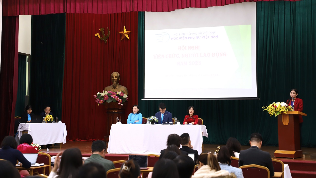 Hội nghị đã nghe đồng chí Hà Thị Thanh Vân – Phó Giám đốc Học viện trình bày báo cáo tổng kết công tác năm 2023, phương hướng, nhiệm vụ năm 2024 và điểm lại từng sự kiện ấn tượng thông qua clip hình ảnh; Đồng chí Hà Thúy Huyền – Trưởng phòng Tài chính kế toán báo cáo công khai tài chính; Đồng chí Đỗ Trọng Tuân – Trưởng Ban Thanh tra nhân dân báo cáo công tác thanh tra nhân dân năm 2023.