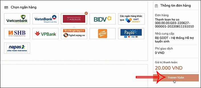 Bước 4: Lúc này thí sinh sẽ nhìn thấy có rất nhiều phương thức thanh toán. Tại mục “Chọn ngân hàng” thí sinh nhấn chọn vào tên ngân hàng muốn thanh toán lệ phí xét tuyển.Thí sinh nhấn chọn vào tên ngân hàng để thanh toán lệ phí, rồi nhấn nút Thanh toán.