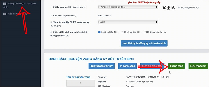 Bước 2: Thí sinh nhấn vào mục Đăng ký thông tin xét tuyển ở thanh menu bên trái. Tiếp đến để thực hiện thanh toán số tiền nguyện vọng, thí sinh nhấn nút “Thanh toán”.