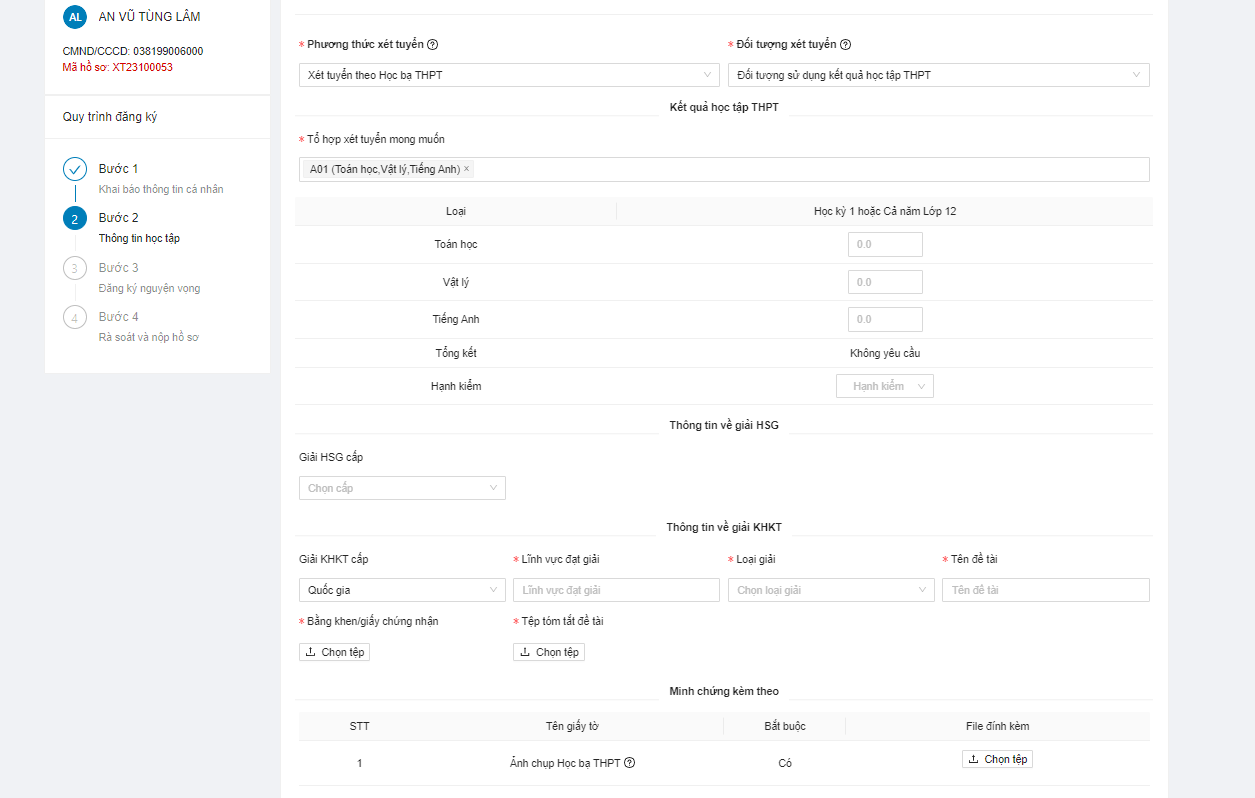 Đối với thí sinh có sử dụng phương thức kết hợp điểm học tập THPT và chứng chỉ tiếng Anh thì sẽ khai các thông tin về chứng chỉ và kèm hình ảnh minh chứng về chứng chỉ.