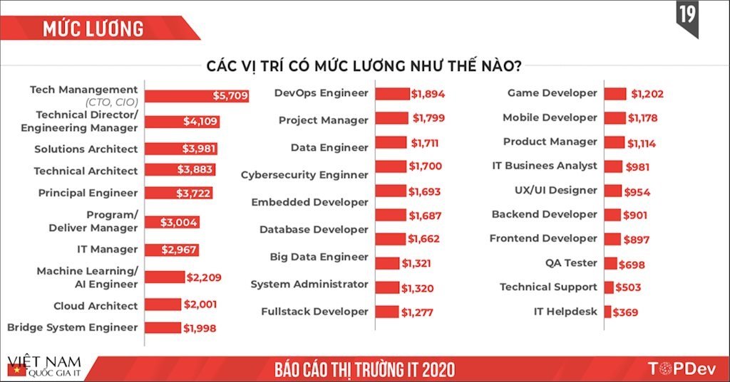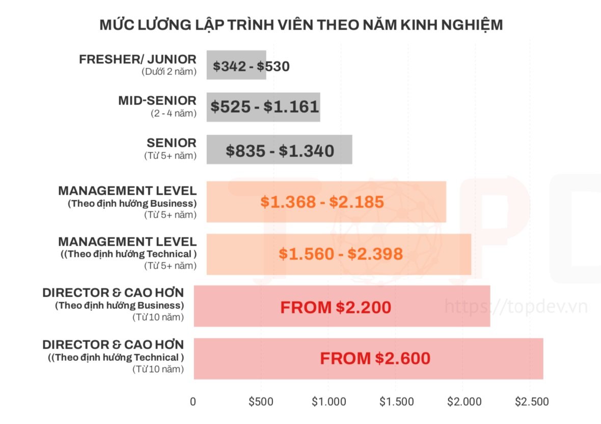 Hiện tại, lương trung bình của lập trình viên tại Việt Nam dao động 10 – 25 triệu đồng mỗi tháng tùy theo kinh nghiệm làm việc. Trong đó, ở phân khúc lập trình web, các lập trình viên mới ra trường có mức lương 8 – 13 triệu đồng cho lập trình viên front-end – những người sử dụng các ngôn ngữ HTML, CSS hay ngôn ngữ lập trình Javascript để các lập trình viên thiết kế ra các giao diện ứng dụng hoặc trang web cho người dùng. Và 11 – 15 triệu đồng cho lập trình viên back-end – người quản lý máy chủ, ứng dụng và cơ sở dữ liệu. Trong khi đó, các vị trí quản lý có mức lương cao dao động 30 – 66 triệu đồng và xu hướng vẫn sẽ tiếp tục tăng trong thời gian tới.
