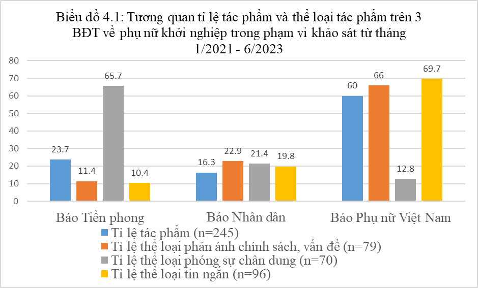 Trong phạm vi nghiên cứu, tác giả đã tiến hành khảo sát các tiêu chí như phân loại đối tượng (vùng miền, độ tuổi), lĩnh vực khởi nghiệp, lý do khởi nghiệp, thâm niên khởi nghiệp, doanh thu/tín hiệu thành công của doanh nghiệp đối với thể loại phóng sự chân dung phụ nữ khởi nghiệp (n= 70) và thống kê số lượng tin, bài phản ánh chính sách hỗ trợ phụ nữ khởi nghiệp (n= 175) để minh định thông điệp trực tiếp và thông điệp ẩn về phụ nữ khởi nghiệp trên BĐT nói chung và trong 3 tờ BĐT thuộc diện khảo sát nói riêng. Nhìn tổng quát, tương quan tỉ lệ tác phẩm và thể loại tác phẩm trên 3 BĐT về phụ nữ khởi nghiệp trong phạm vi khảo sát có sự phân hóa rõ rệt và tương thích với mức độ ưu tiên, tập trung dung lượng đăng về chủ đề này theo tôn chỉ, mục đích của mỗi đơn vị báo chí đã lý giải ở trên.