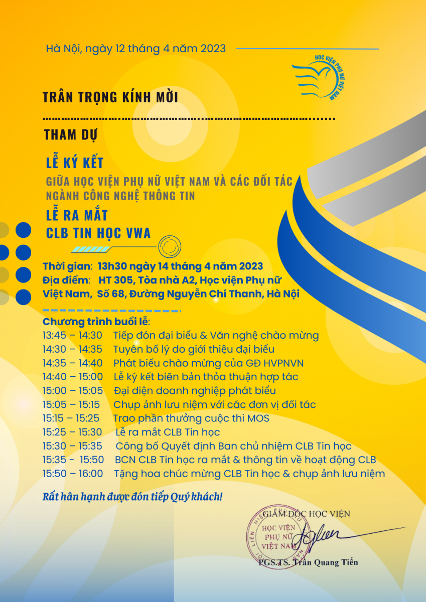 Trân trọng kính mời quý thầy cô, quý doanh nghiệp và các bạn sinh viên tham dự sự kiện: Lễ ký kết thỏa thuận hợp tác với các đối tác ngành Công nghệ thông tin và Lễ ra mắt Câu lạc bộ Tin học VWA.