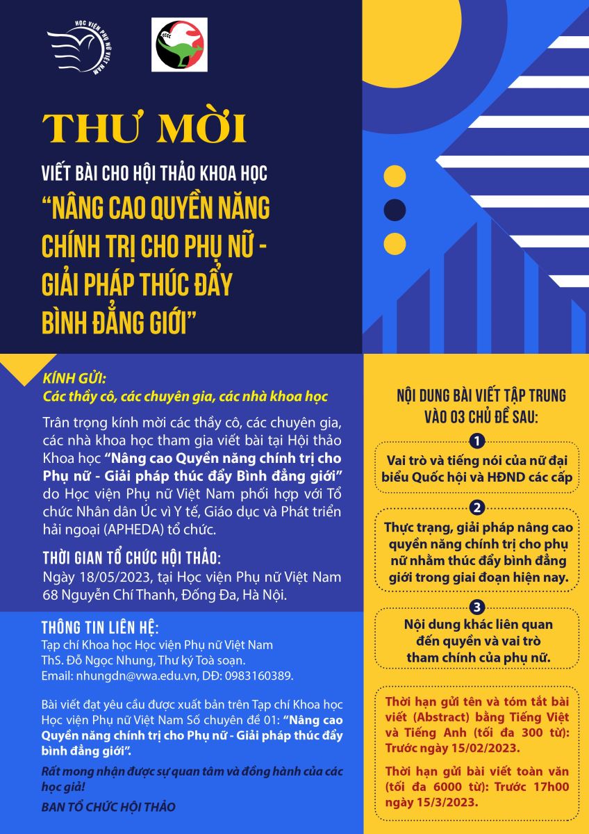 Thư mời viết bài HT khoa học: “Nâng cao quyền năng chính trị cho phụ nữ – Giải pháp thúc đẩy bình đẳng giới”