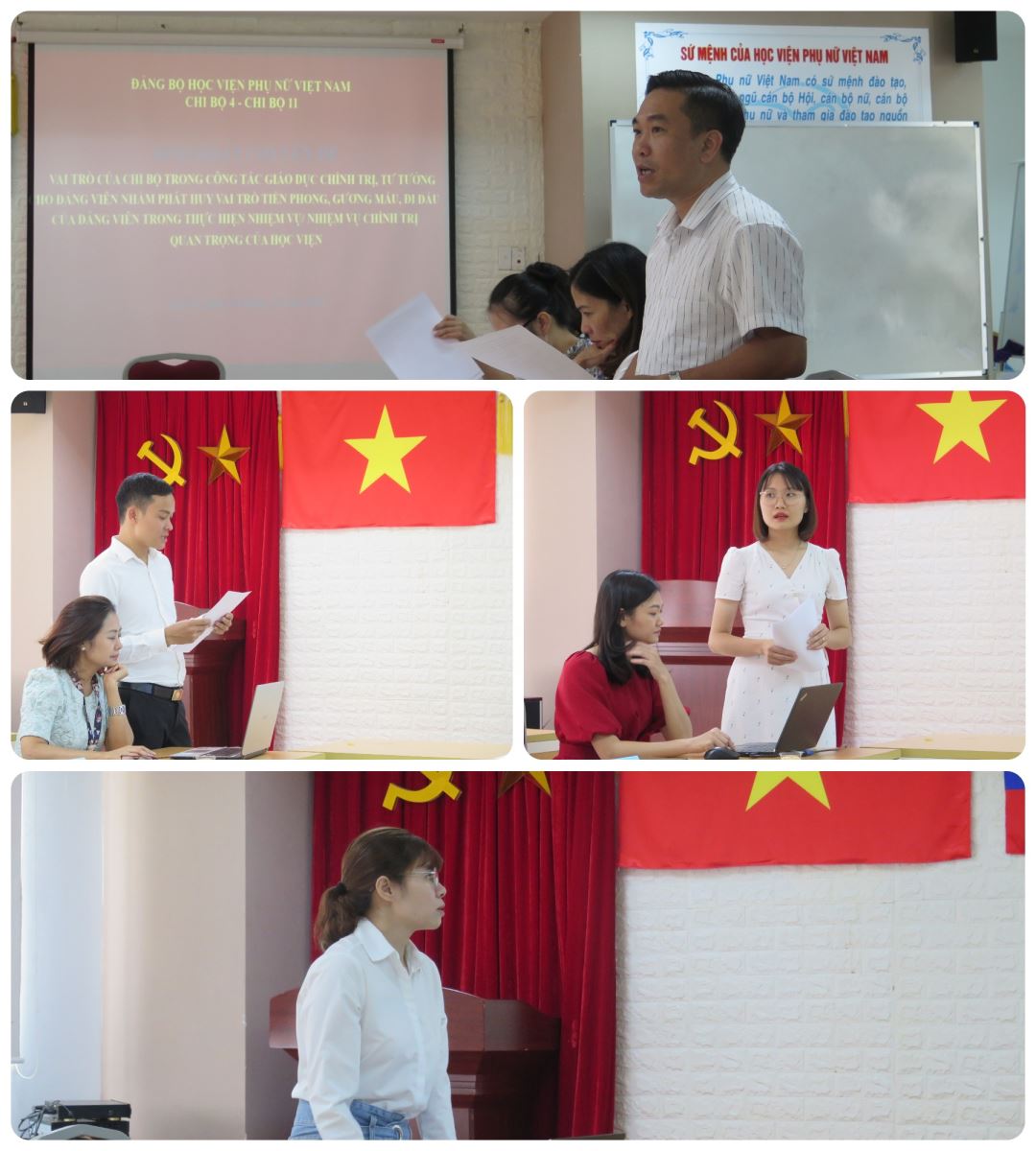 Phát biểu tại buổi sinh hoạt chuyên đề, đồng chí Trần Thị Vân Oanh, Bí thư Chi bộ 4 cho biết: Việc giáo dục chính trị, tư tưởng, thúc đẩy vai trò tiên phong, gương mẫu của đảng viên trong thực hiện nhiệm vụ chính trị là vô cùng quan trọng. Đặc biệt, công tác chuyên môn của các bộ phận thuộc chi bộ 4 và chi bộ 11 liên quan đến hầu hết các mảng công việc của toàn Học viện nên yêu cầu này càng cần được nâng cao. Thông qua buổi sinh hoạt chuyên đề này, hi vọng mỗi tham luận được trình bày sẽ là những nguồn năng lượng tích cực, xâu chuỗi, chia sẻ những kinh nghiệm thực hiện tốt công việc được giao tại các bộ phận nhằm tăng cường hiệu quả, đóng góp vào sự phát triển chung của Học viện.