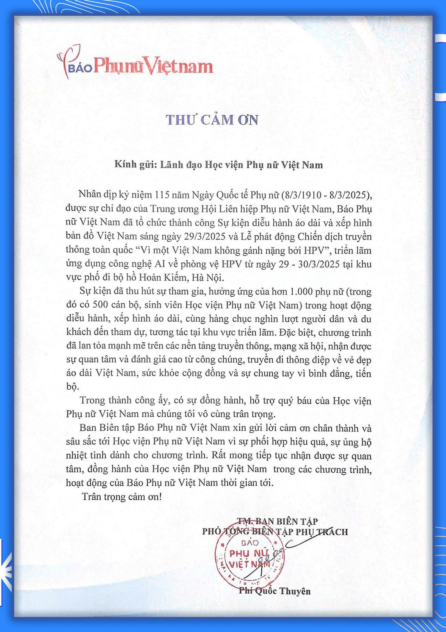Báo Phụ nữ Việt Nam gửi thư cảm ơn Học viện tham gia sự kiện diễu hành áo dài và xếp hình bản đồ Việt Nam