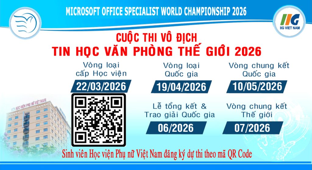 Cuộc thi Vô địch Tin học Văn phòng Thế giới 2026 do Trung ương Đoàn phối hợp với IIG Việt Nam tổ chức là sân chơi quy mô toàn cầu nhằm tôn vinh những tài năng trẻ xuất sắc nhất về kỹ năng sử dụng các ứng dụng Microsoft Office. Tiếp nối bảng vàng thành tích từ các mùa giải trước, Học viện Phụ nữ Việt Nam chính thức phát động vòng loại cấp cơ sở vào ngày 22/03/2026 để tuyển chọn những sinh viên giỏi nhất tham dự vòng loại quốc gia và chinh phục tấm vé đến Hoa Kỳ.